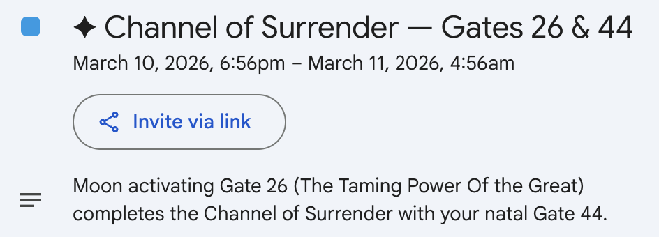 And, you can download the ics file that contains your personal activations and add it to your preferred calendar so you can see exactly when the Moon activates a complete channel in your design over the next 28 days.