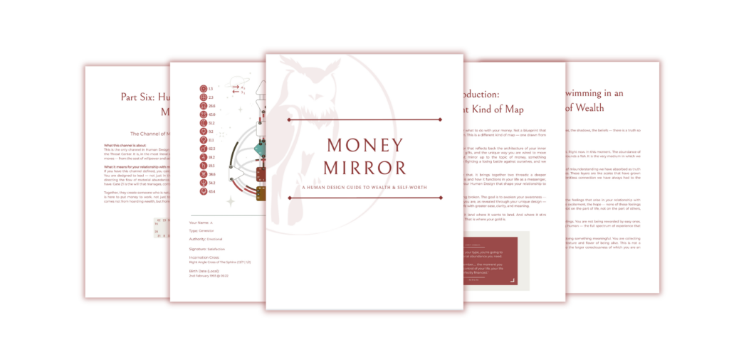 Money Mirror: A Human Design Guide to Wealth & Self-Worth is a comprehensive Human Design report that reveals why your relationship with money feels the way it does — and what your unique design is trying to show you.